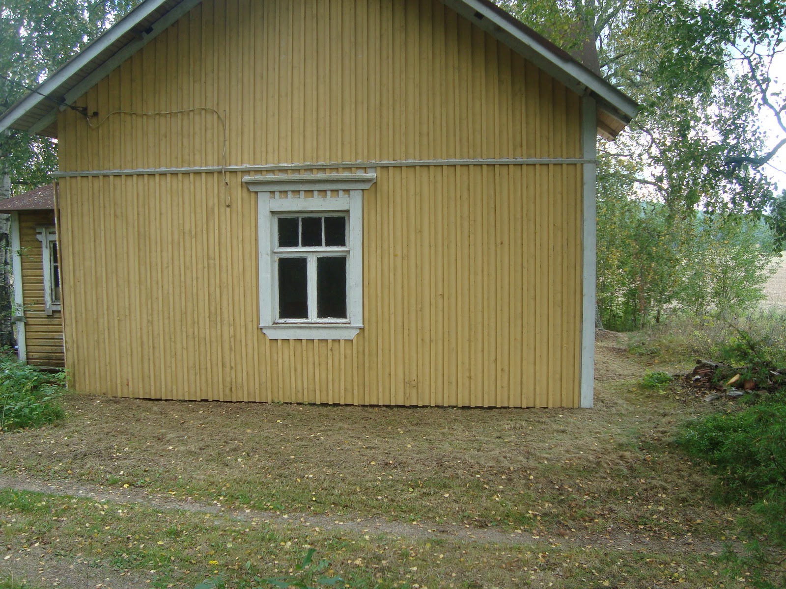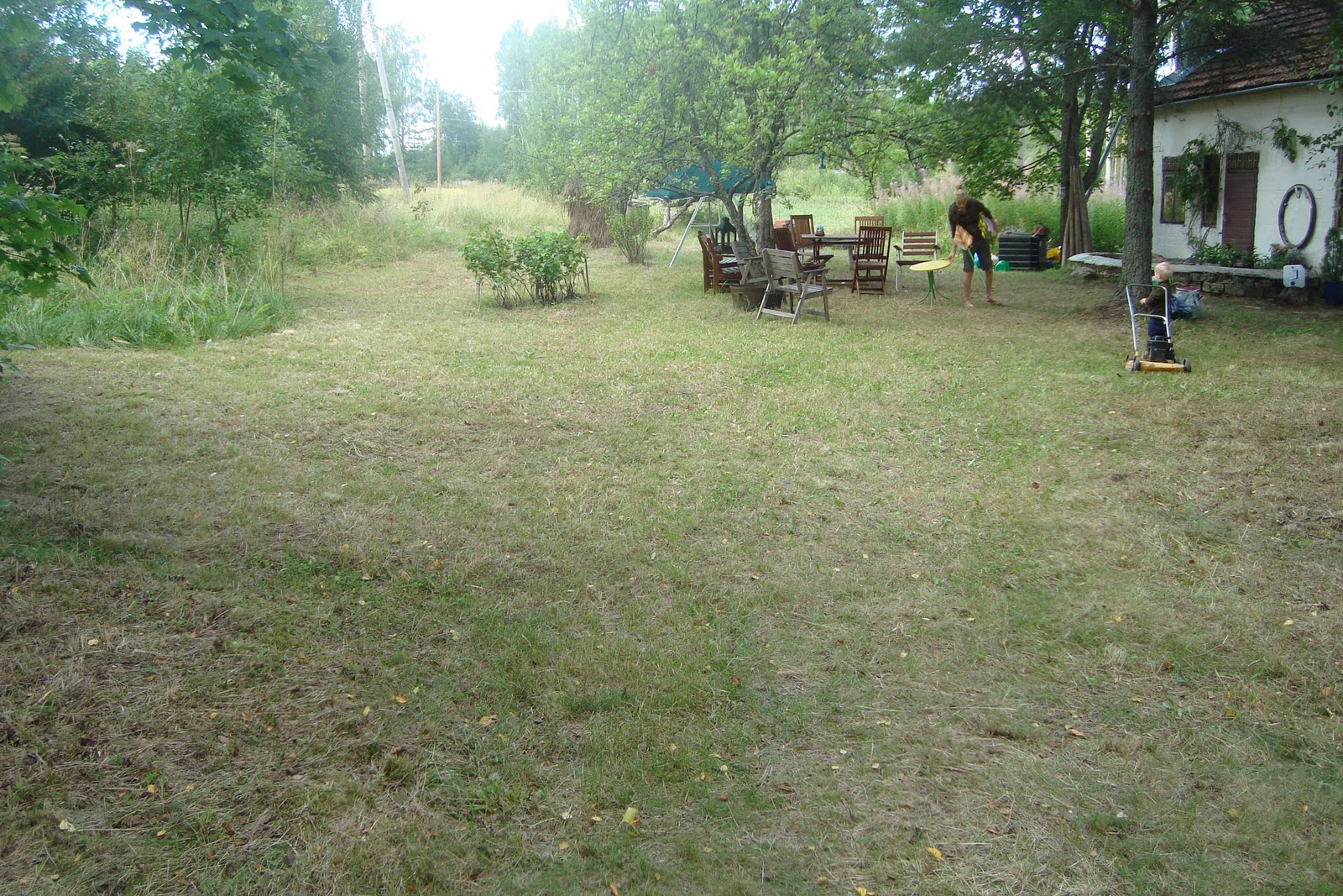 | Muutama kierros mökin ympäri ruohonleikkurilla ja alta paljastui mökki. Maa talon ympärillä on päässyt nousemaan jo niin korkealle ettei pohjan tuuletusaukkojakaan enää näy. |