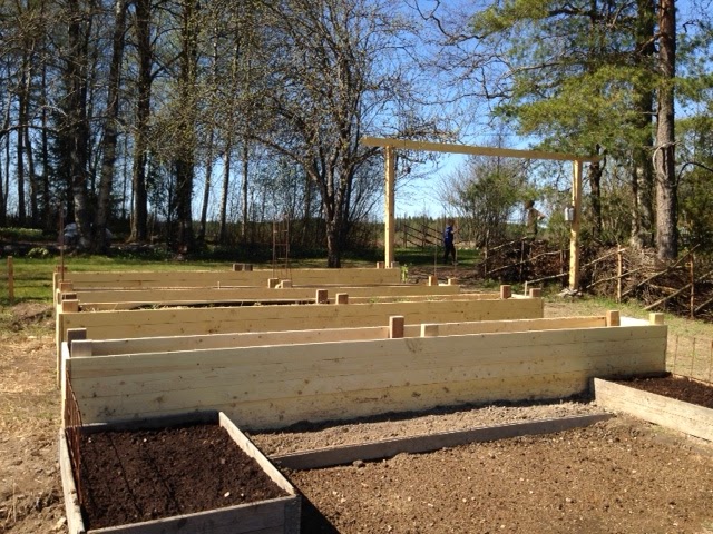 Enää ei ollut harmaata. Varpaatkin pääsivät nauttimaan maasta ja sen lämmöstä. Kerättiin vuohenputkia ja syötiin metsästä ketunleipiä. Istutettiin uusiin kasvulaatikoihin perunaa, mansikkaa, papuja, herneitä, lehtikaalia, salaattia, kukkia, kesäkurpitsaa...Saatiin nauttia lämmöstä. Lämmin tosiaan oli kun lapioitiin kasvulaatikoihin multaa auringon paahteessa.