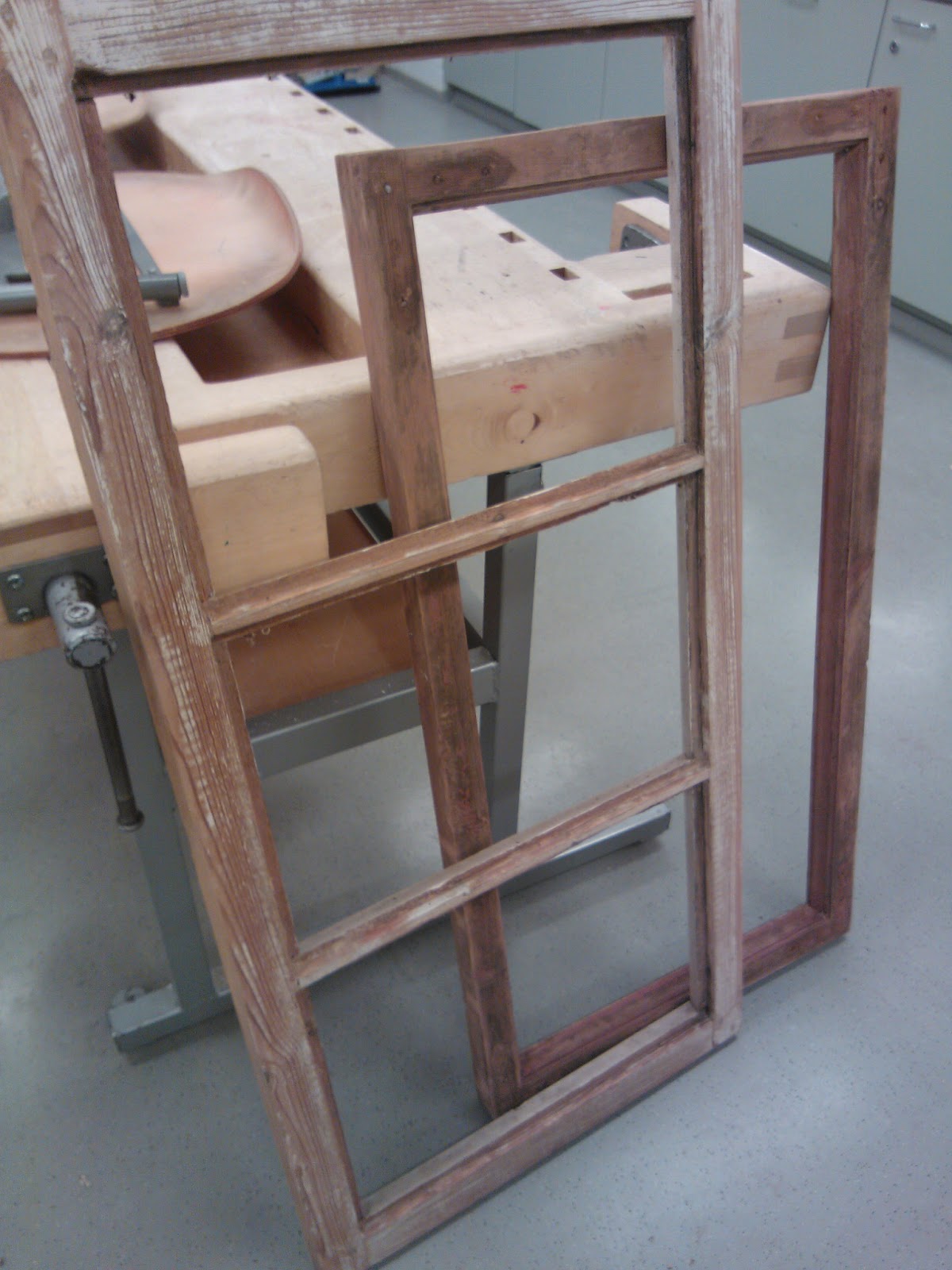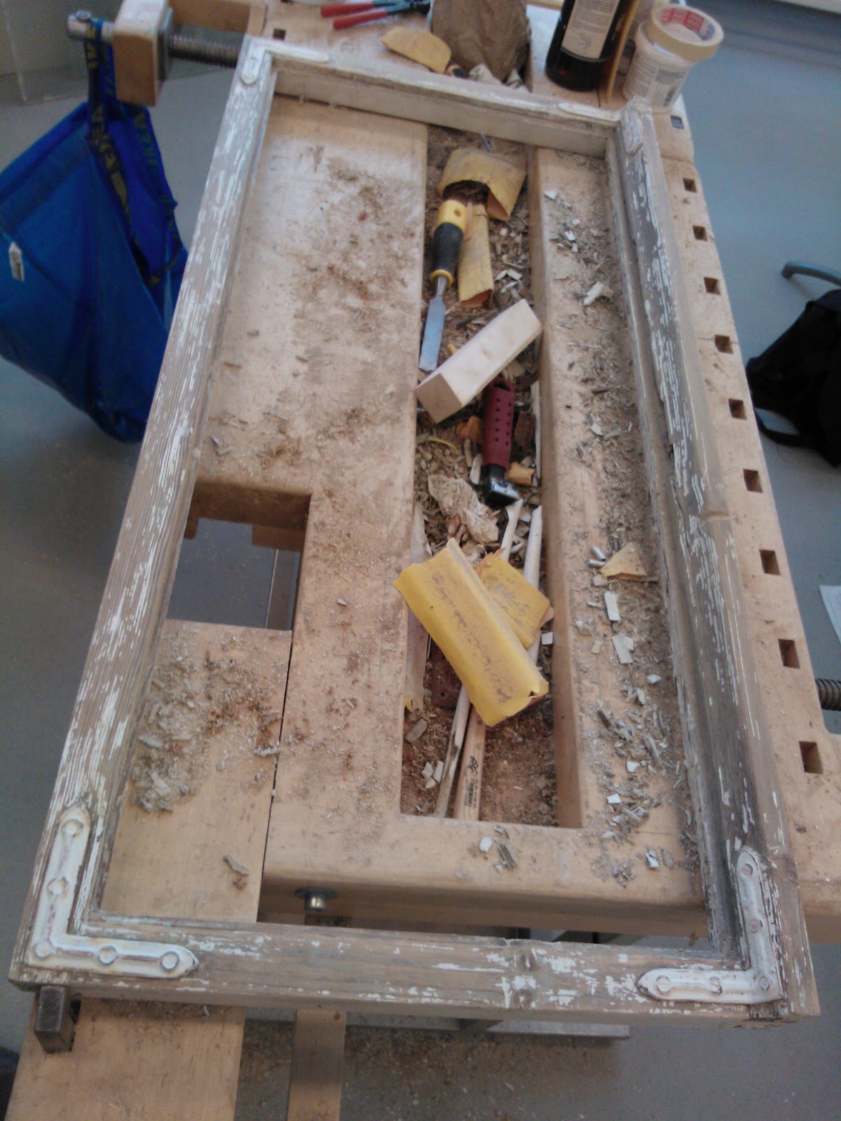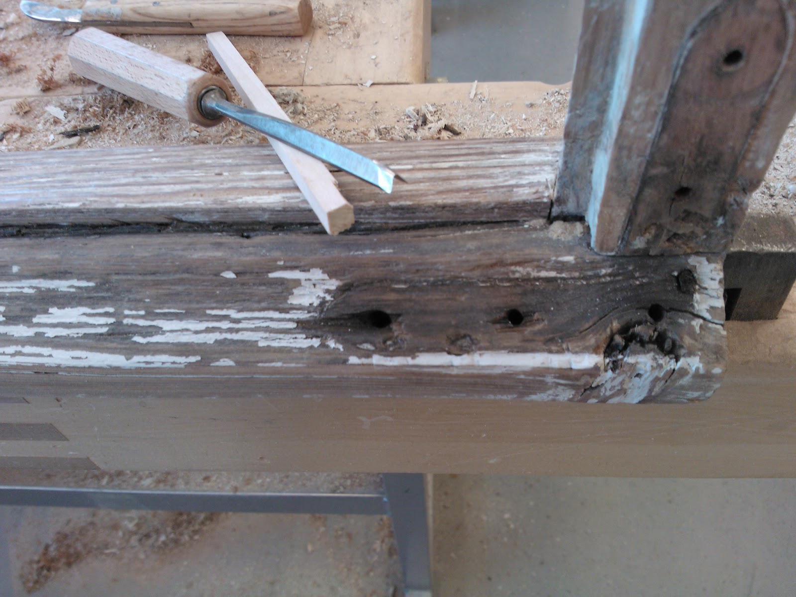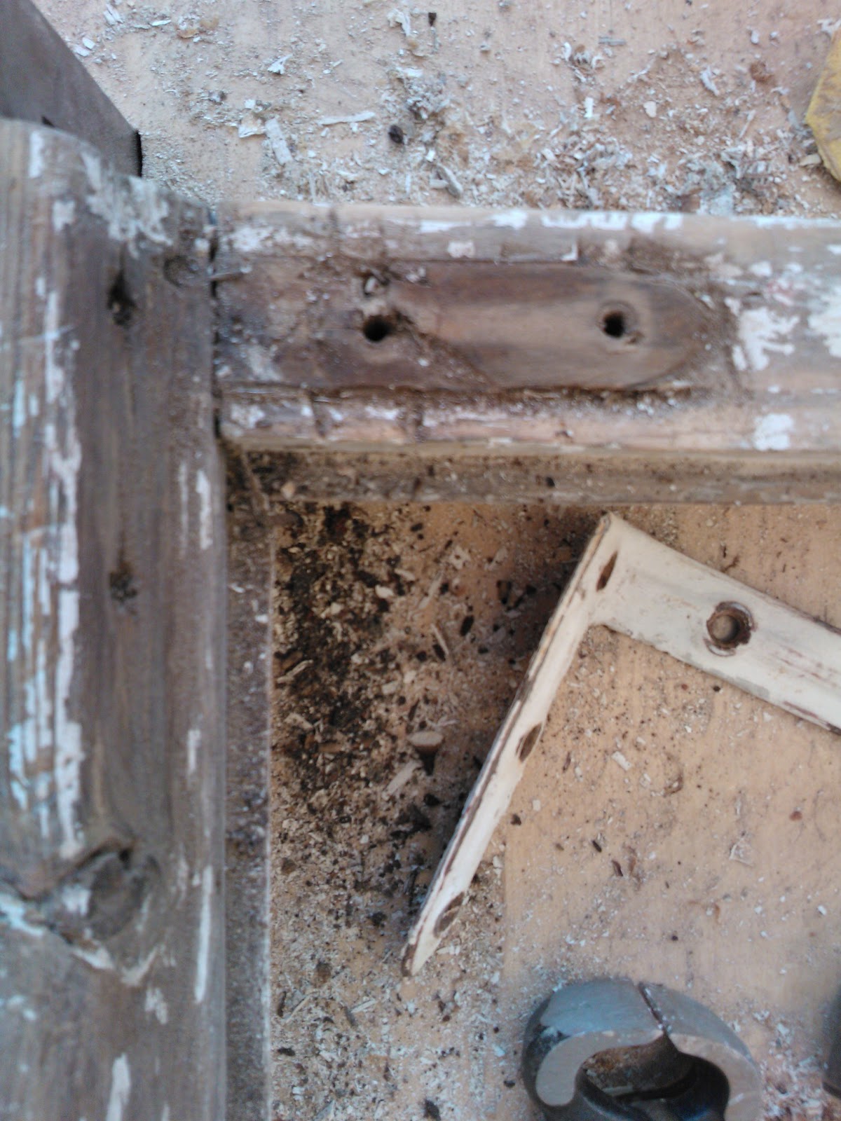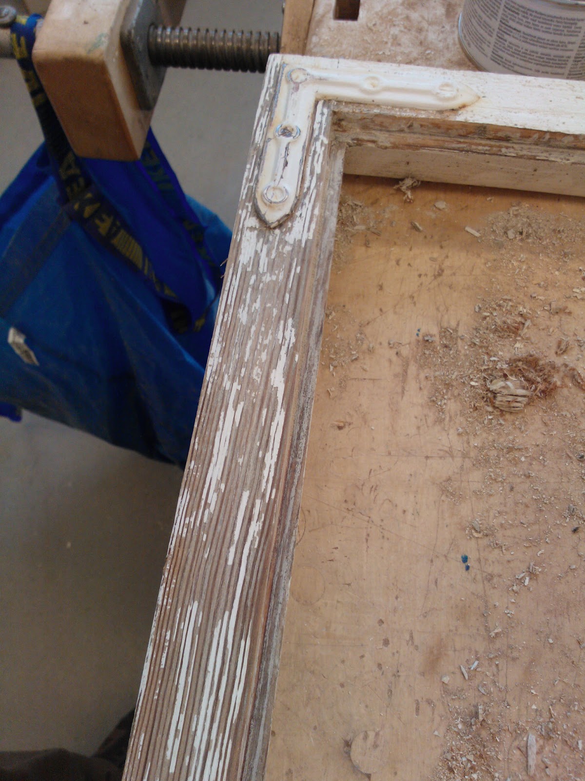 Maalin poistamiseen on monta tapaa. Vanhaa maalia voi irroittaa siihen tarkoitetulla maalinpoistoaineella, kuumailmapuhaltimella, infrapunalämmittimellä, hiomakoneella tai rapsuttamalla. Itse tein työn rapsuttamalla, enkä kokenut sitä kovinkaan työlääksi. Toisaalta kaikki riippuu siitä minkälainen maalipinta ikkunassa on. Olettaisin että edellämainitut tavat ovat kaikki hyviä. Infrapunalämmittimen etuna on se että sitä voi käyttää jo kitinpoistovaiheessa, eikä se riko ikkunan lasia. Itselläni oli ostettuna maalinpoistoon tarkoitettu kaavin joka osoittautui muuten hyväksi, mutta vaihtoteriä olisi saanut olla paljon lisää. Tähänkin työhön toimi parhaiten kunnon teräväreunainen leveä taltta. Ikkuna oli tukevasti höyläpenkissä kiinni ja maalin poistaminen onnistuikin hyvin pitämällä talttaa sopivassa kulmassa reuna pokaa vasten ja vetämällä tasaisesti itseä kohti. Parhaan ja tasaisimman lopputuloksen saa poistamalla huolellisesti kaiken maalipinnan ja hiomalla lopuksi vielä hiekkapaperilla. Kulmaraudat oli kiinni vanhoilla talttapäisillä ruuveilla jotka oli päällemaalattuja. Veitsenkärjellä sain pahimmat maalit lohkeamaan sen verran että näki kannan suunnan. Tiukimmat ruuvit lähtivät aukeamaan napauttamalla pari kertaa vasaralla ruuvimeisseliä, jolloin se upposi hieman syvemmälle ruuvin kantaan. Kulmarautojen alta saattaa paljastua varsin ikävä näky kuten kuvassa, jos raudan ja puun väliin on vuosien saatossa mennyt kosteutta. Jos kaikki pinnat ovat ehjiä, hiottu ja putsattu voidaan pokat pohjamaalata. Maalauksesta ja paikkaamisesta lisää seuraavassa päivityksessä.