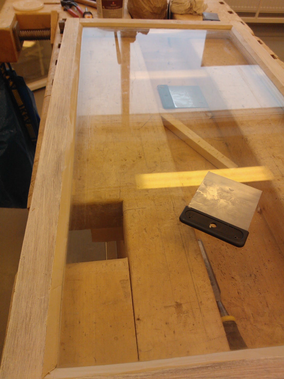Seuraavaksi tarvitaan pieni vasara, pala pahvia ja stiftilankaa. Vaihtoehtoisesti voit käyttää pieniä nauloja joiden paikallaanpitämiseen tarvitset luultavasti pihdit. Vasarointi tapahtuu naputtelemalla stiftilankaa jonka kärki on taitettu. Lopuksi kääntele lankaa edestakaisin, niin se katkeaa taitoksen kohdalta. Stiftin tulisi olla sopivalla syvyydellä niin että se on millin korkeudella lasista mutta jää tulevan kitin alle, ja pitää ruutua paikoillaan. Käytä pientä pahvinpalaa lasin ja vasaran välissä naarmujen välttämiseksi. Kun kaikki on paikallaan voit aloittaa ulkopinnan kittaamisen. Itse aloitin kitin levittämisen kuvassa näkyvällä lastalla, mutta huomasin että se on nopeampaa pyörittelemällä ensin "pötkylöitä" ja painelemalla sitä käsin reunaan. Koko ikkunaremontin yksi hankalimmista kohdista on seuraava jossa näkyvän puolen kittauksesta yritetään saada mahdollisimman tasainen. Tätä työvaihetta varten sain käsiini yksinkertaisen mutta toimivan työkalun. Tavallisesta ruokailuveitsestä oli teräpäästä leikattu hieman vinosti palanen ja ilmeisesti hiottu pahimmat rosoisuudet pois. Idea tässä on se että ylimääräinen kitti kaavitaan veitsellä pois niin että lopuksi ympäri lasin kulkee siisti ja tasainen pinta. Aseta leikattu kohta veitsestä lasia vasten niin että toinen kulmista on lasin alla näkyvän pokan sisimmän reunan alussa. Käännä veistä sopivaan kulmaan jotta se lepää pokan päällä ja edellämainittu kulma on kohdallaan. Kuljeta veistä eteenpäin niin että se kaapii ylimääräiset kitit ja pysyy koko ajan paikallaan jottei kittauksesta tule epätasaista. Syy miksi veitsen toinen kulma kulkee lasin alla näkyvää reunaa pitkin, on se että kun toiselta puolelta poistetaan pursunneet kitit, ei etupuolen kittaus saa näkyä sisälle.