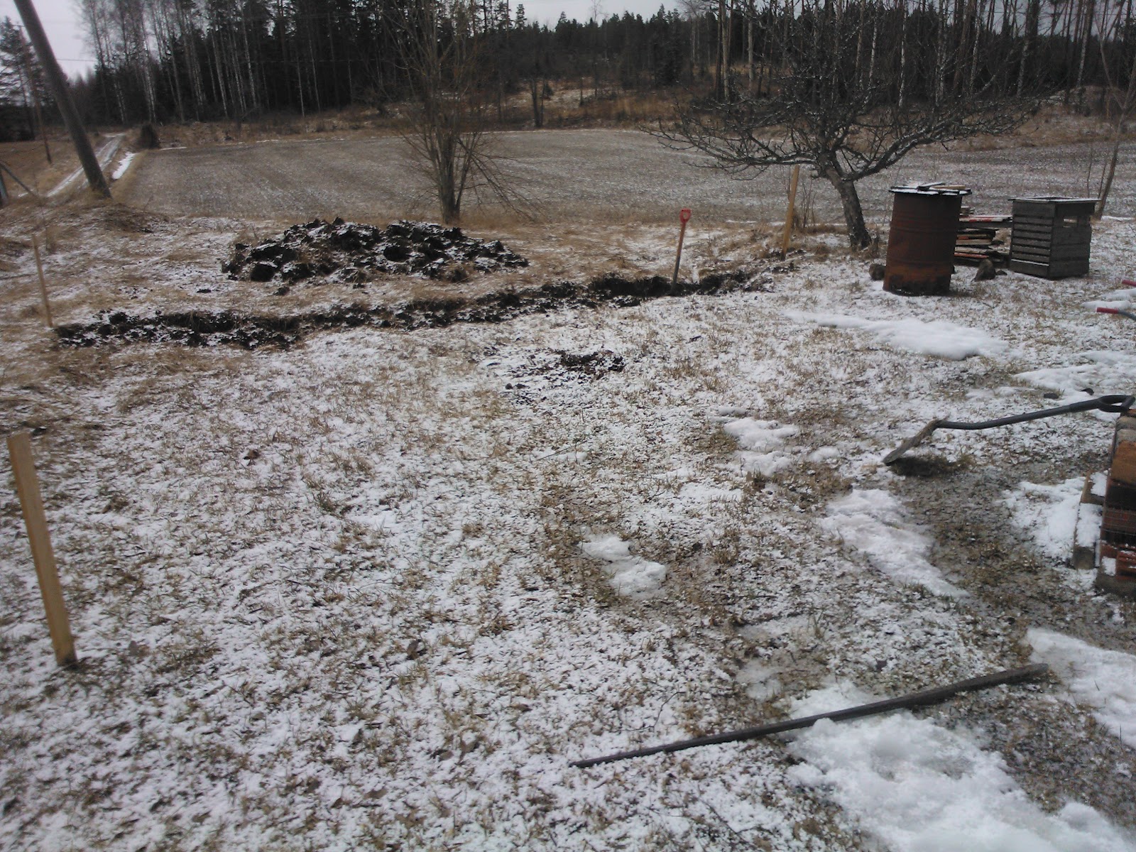 | Muutaman tunnin kaivuun jälkeen alkoi tietenkin sataa lunta. Hetken aikaa kerettiin pelätä pidempää sadetta mutta 20 minuutin päästä ilma onneksi jo selkeni. Lunta tuli kuitenkin sen verran että maa hieman kastui ja teki savesta ihanan mutaista joka tarttui saappaisiin isoina paakkuina. |