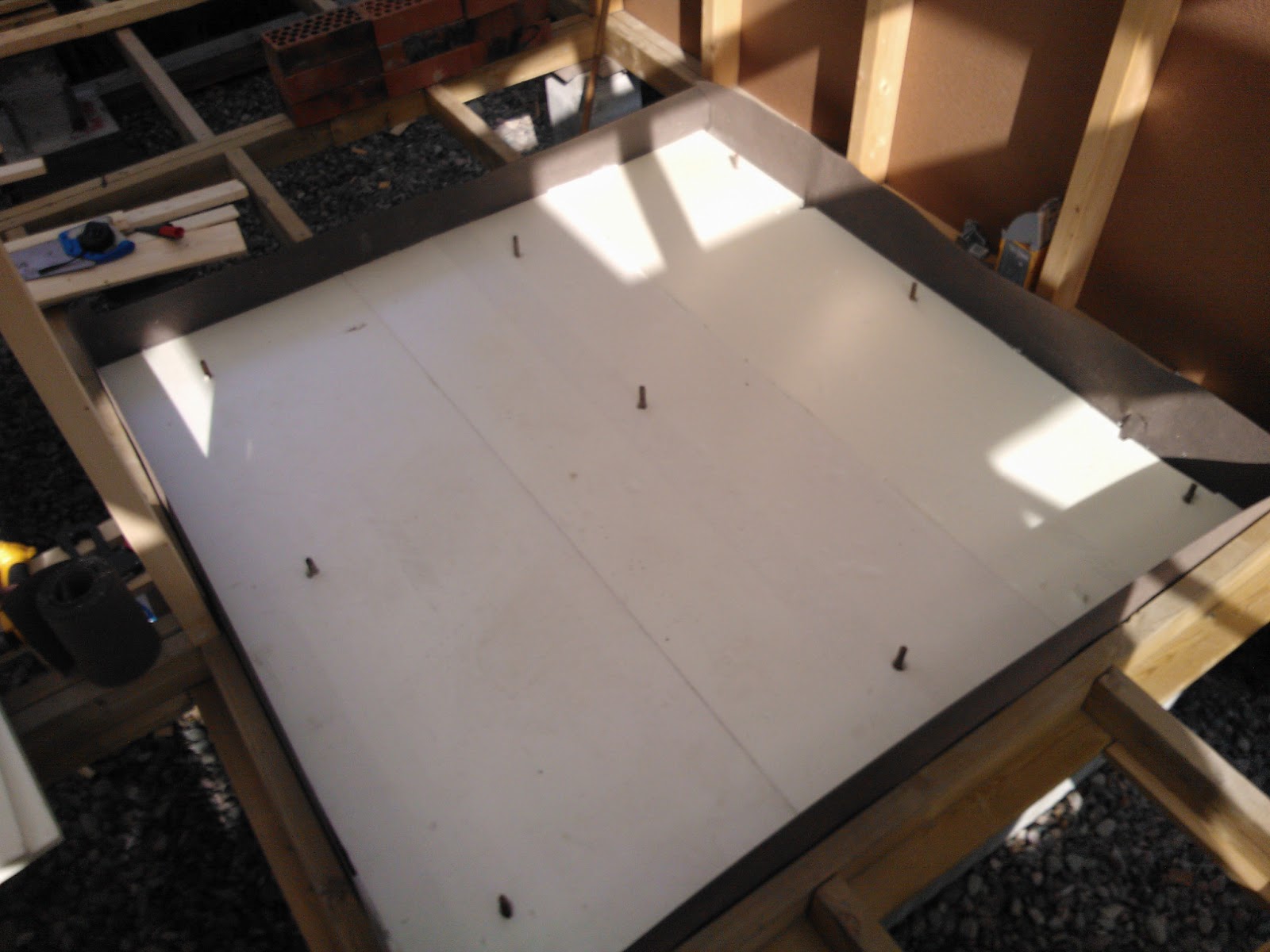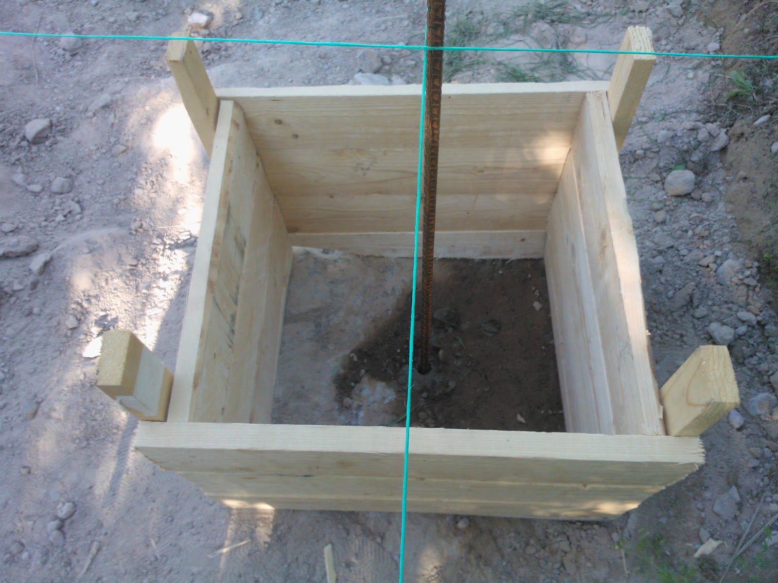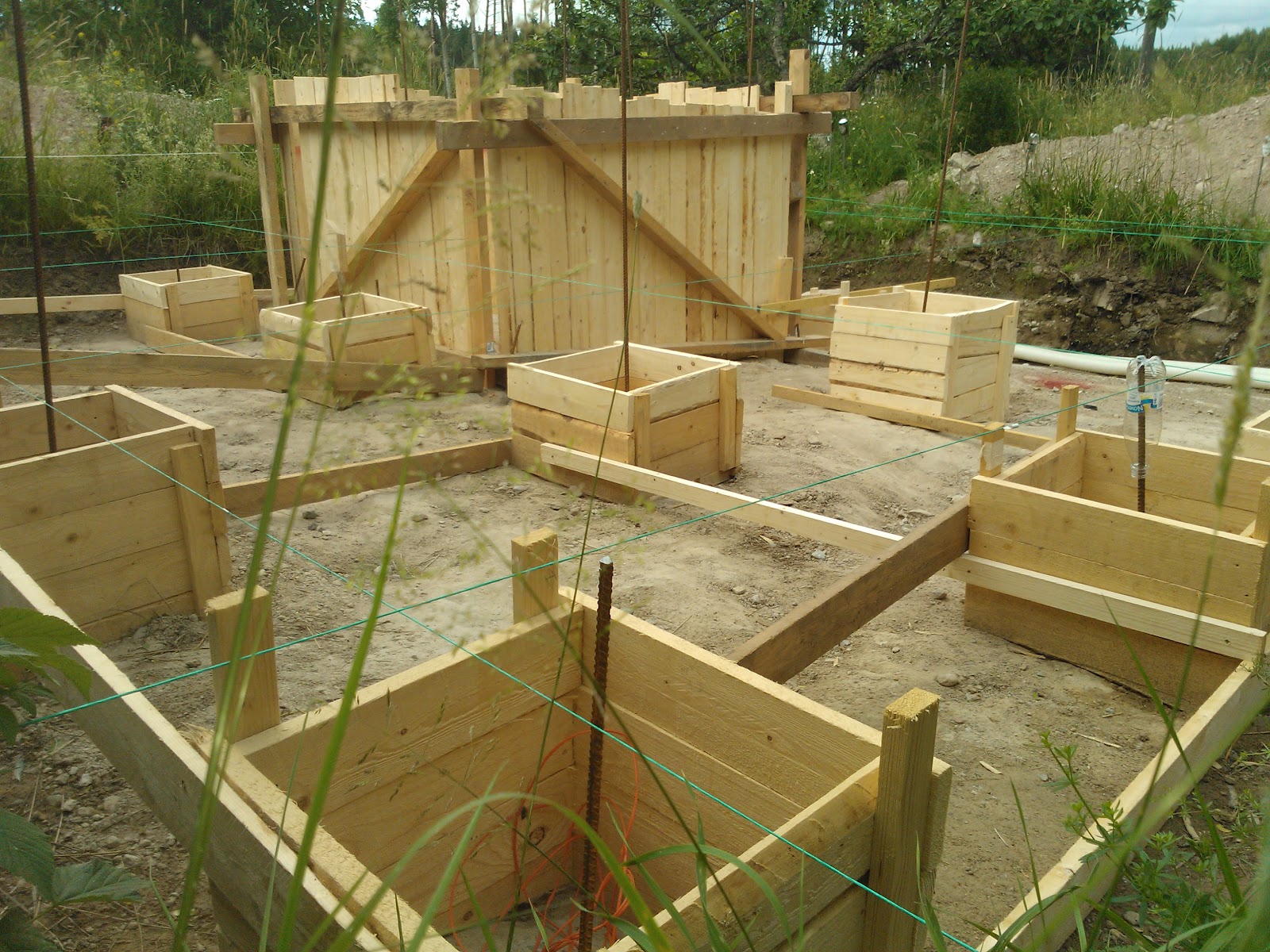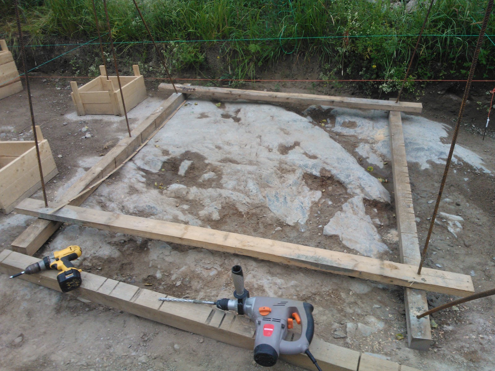 Kaivuutyöt jatkuvat, kunnes koko kallio näkyy. Jäljellä oleva maa-aines on ilmeisesti jokin luontoäidin valama betonikerros. Lapio uppoaa tasan kaksi senttiä kunnes kuuluu kolahdus ja käsissä tärähtää. Talikko oli tähän hommaan oiva ratkaisu. Ensin pehmitetään talikolla ja sitten kaivetaanruntataan- puntataanheitetään (tripla työ). Ja pakkohan sieltä kuopan pohjalata muutama tällainenkin kivi kuuluu löytyä. Onneksi vanhempi poikamme oli mukana ja kaivoi sen pois (isin oma apuri). Homma on nyt siis sitä vailla että kotiin tulee kirje jossa vastaava työjohtaja on hyväksytty. Tämän jälkeen mitataan paikat ja katsotaan että hommat etenee oikein. Tämän jälkeen voidaan alkaa rakentaa pilarilaatikoita ja laittamaan raudoituksia kuntoon. Kaivaukset ovat nyt valmiit. Hieman rapsuttelua / harjaamista tolppien kohdilta, niin että saadaan puhdas kivi esiin. Kyllähän tuo luontoäiti koetteli matkan varrella mutta antoi lahjaksi kalliopohjan jossa kaatokin on valmiina. Taas oli roskalavalla paljon hyödyllistä tavaraa. Alimman kuvan pöytä saatiin aikaiseksi neljästä lavalaidasta ja pöytälevystä. Korkeus pöydässä sattui olemaan juuri sopiva ja kas vanha pöytäkin oli millilleen oikean levyinen. Tässä siis ilmainen ja tanakka pöytä. Lavalaidoille keksittiin heti muutakin käyttöä, kuten pieni hiekkalaatikko ja mansikkamaan reunus johon oli helppo laittaa verkko päälle. Toinen hauska löytö oli kasa vanerilevyjä jotka joku olikin kiltisti sahannut 40x70cm leveyteen ajatellen varmaan meitä koska valumuotit on kokoa 40x40xKORKEUS. (jottei lastensuojelunkin tarvitse osallistua rakentamiseen, on töpseli otettu irti sirkkelistä)