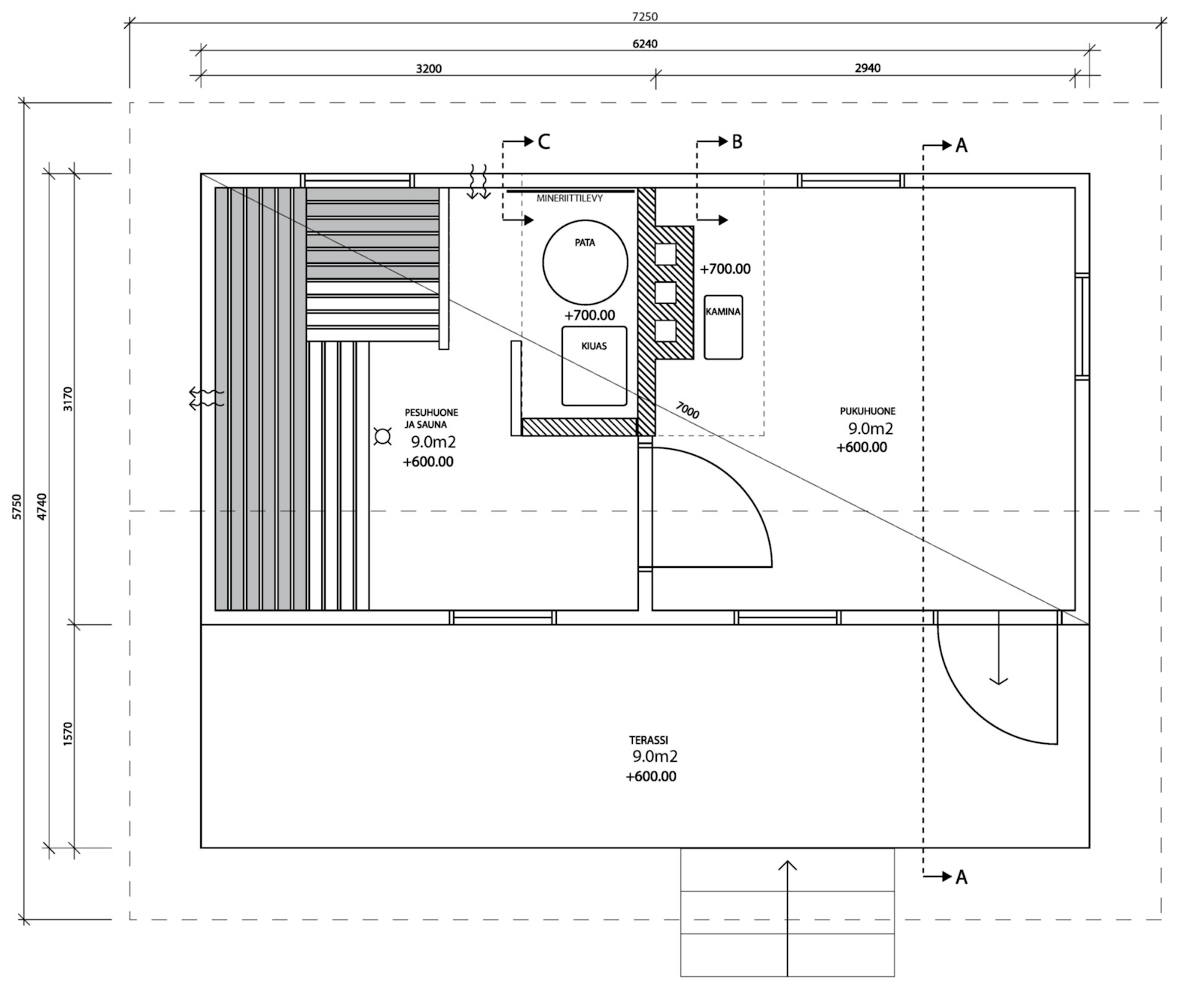 Runko tehdään paksummasta puusta ja porataan harjateräkset vinosti kallioon.