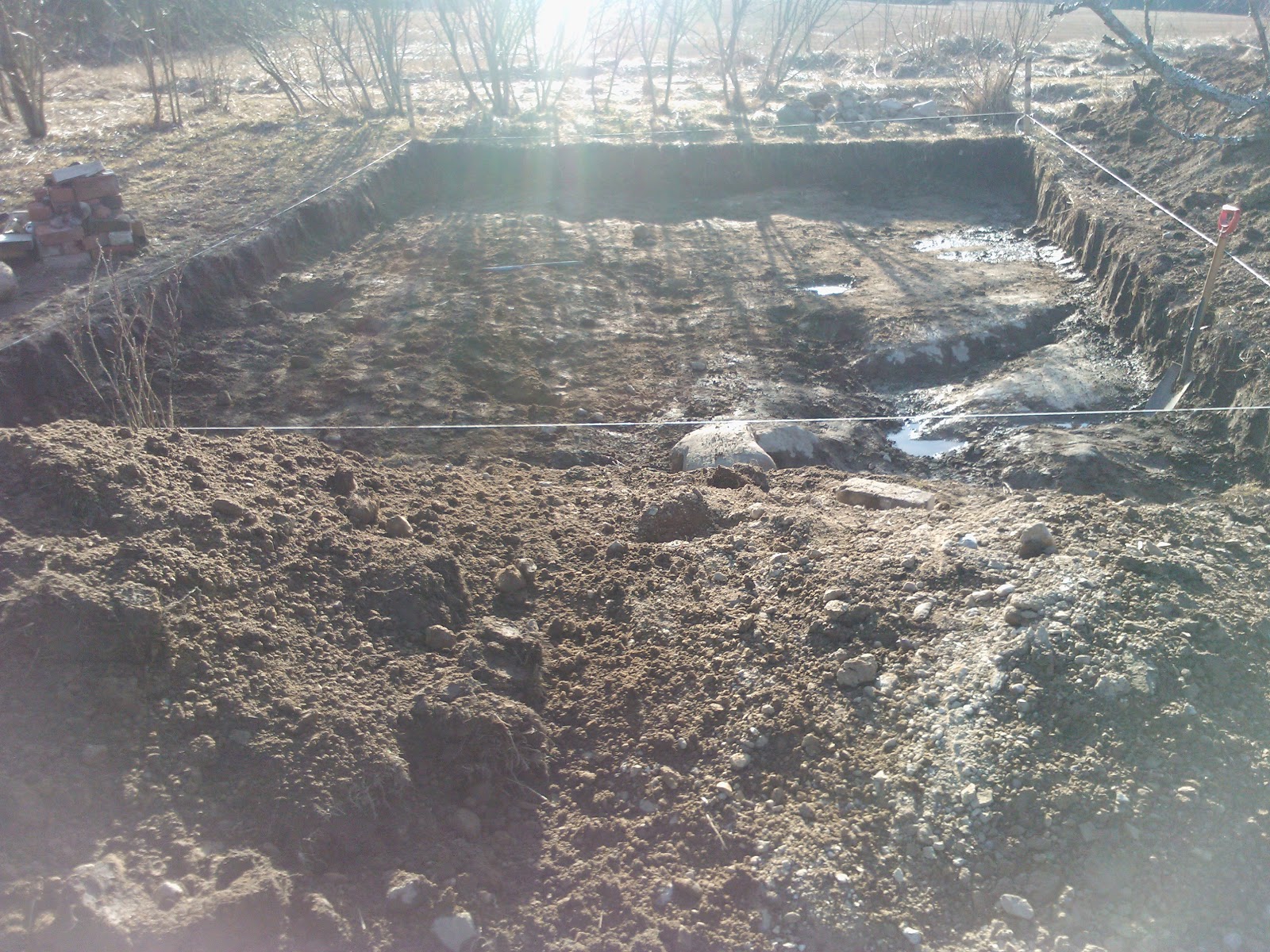 | Ensimmäisen päivän saldo oli 7,0 x 1,5 metriä eli noin 1/4 osa koko alasta. Ensin pelättiin että maa on täysin savinen mutta n. 30cm syvyydestä löytyi kovaa punertavaa pienikivistä maata. Sitä raapimalla ja kaivamalla 20cm esiin tuli kallio =). Vaikka kallio olikin erittäin iloinen yllätys se peittää kuitenkin vain puolet kaivettavasta alasta joka voi aiheuttaa painaumaa talon kalliottomaan päähän. Yritettiin kaivaa toista päätyä vielä 40cm syvemmälle muttei kalliota ainakaan siinä tullut vastaan. Näitähän ei voi tietää ilman teetettyä maapohjatutkimusta mutta kaivetaan lisää ja katsotaan mitä eteen tulee. |