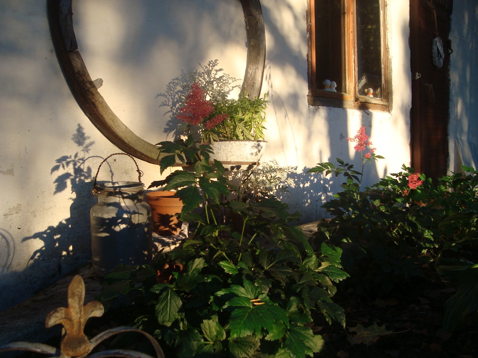 | Muutaman päivän niittämisen jälkeen kalusteet löysivät oman paikkansa omenapuiden varjosta |