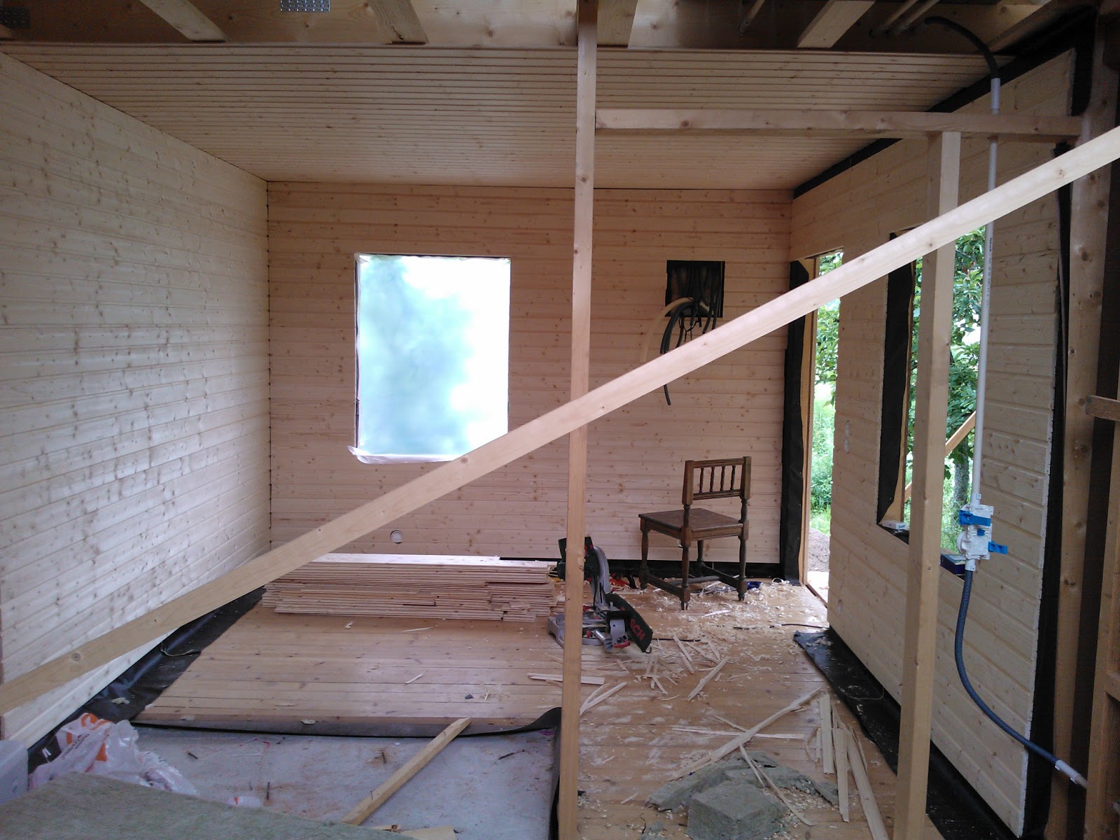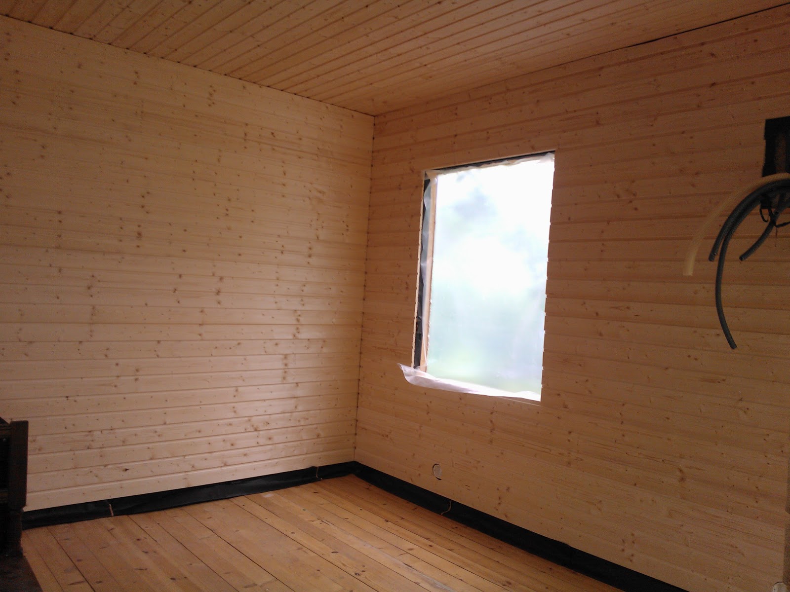 Nyt on pukuhuone miltein valmis tai ainakin käyttökelpoinen tai ainakin paneloitu. Puuttuuhan tuosta vielä ovet, ikkunat, listat, tiiliseinä, lattian kiinnitys, sähköt... Eli hommia riittää vielä.