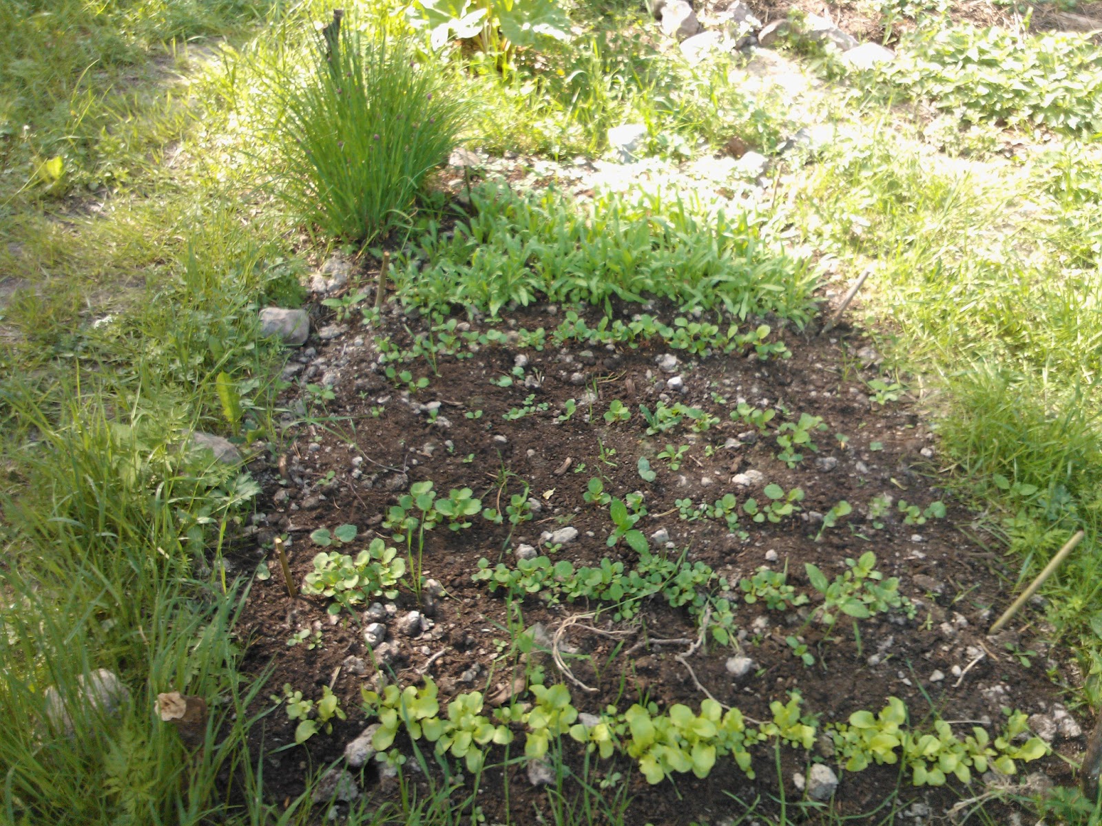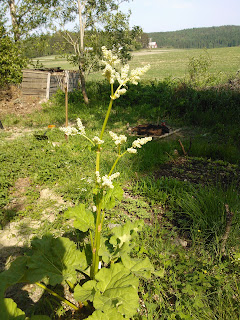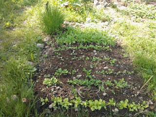 Kasvihuoneessa yrtit olivat lähteneet mukavasti kasvamaan ja samoin porkkanat olivat saaneet reilusti lisää pituutta varsiinsa. Kukkapenkissä kukkien pienet taimet pilkistivät nätisti omissa riveissään ja raparperi oli kukkineen venähtänyt rutkasti. Perunat pilkistivät kasvihuoneen viereisessä penkissä n.5 cm ja mansikantaimet olivat alkaneet kukkimaan enteillen ainakin muutamaa mansikkaa tänä kesänä!