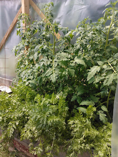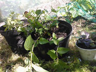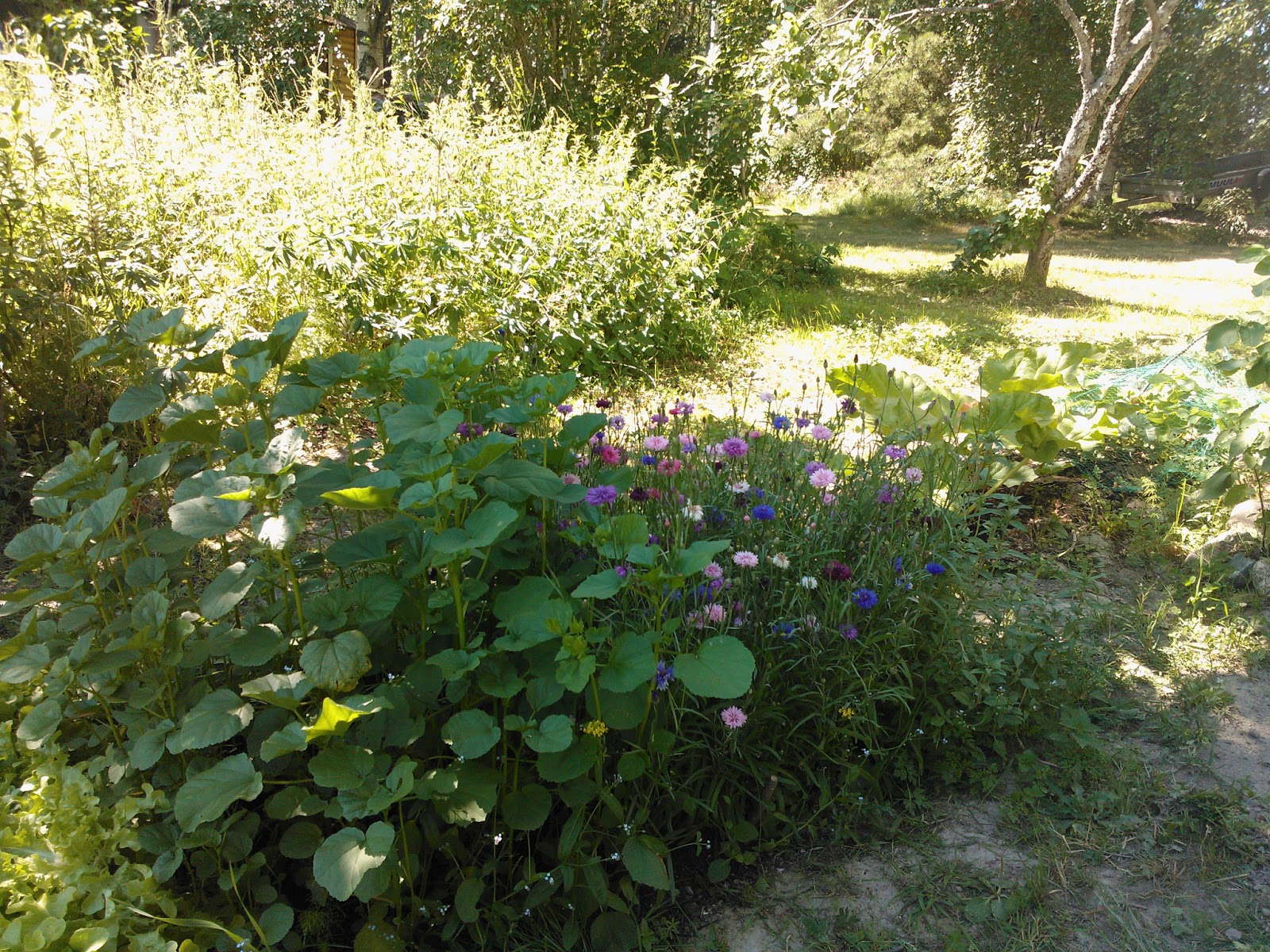Edellä vielä vähän kuvia kasvaneista kasveista jotka tuovat iloa joka kerta mökille tullessamme. Perunat voivat oikein hyvin ja samoin tomaatit ja porkkanat kasvihuoneessa. Kasvihuoneeseen laittamamme yrtit ovat myös kasvaneet hienosti, mutta ovat ehkä jo ylikasvaneita. Leikeltiin tänään esim.tillin kukinnot pois...Kasvihuoneeseen laittamamme salaateista ei ole jäljellä enää mitään, koska ne kärsivät pahasti kuumuudesta. Samoin herneet ovat kärsineet lintuvieraista ja pavut selvästi kuumuudesta. Saa nähdä saadaanko niistä mitään satoa, mutta ensi vuonna ne pääset kaikki ehdottomasti ulos kasvimaalle eikä kasvihuoneeseen.Krassi viihtyy tänäkin vuonna rautapadassa ja kesäkurpitsat kompostin hellässä huomassa. Kukkamaalla ruiskukat ovat jo kauniisti auenneet ja ne ovatkin ihana väriläiskä pihalla. Viinirypäleköynnös on kasvanut hurjasti kasvihuoneen lämmössä ja toivon mukaan jaksaa odottaa varsinaisen kasvihuoneen rakentamista jotta saa pysyvän paikan ja pääsee kunnolla kiipeämään. Valkoinen kärhö on kasvattanut ihania pulleita kukan nuppuja pitkin omenapuuta kiipeileviin varsiinsa, tämäkin näyttää siis viihtyvän. Jes! Mintut laitoin uuteen multaan hieman isompiin ruukkuihin, avomaalle en viitsi niitä istuttaa kun ovat niin kovia leviämään...