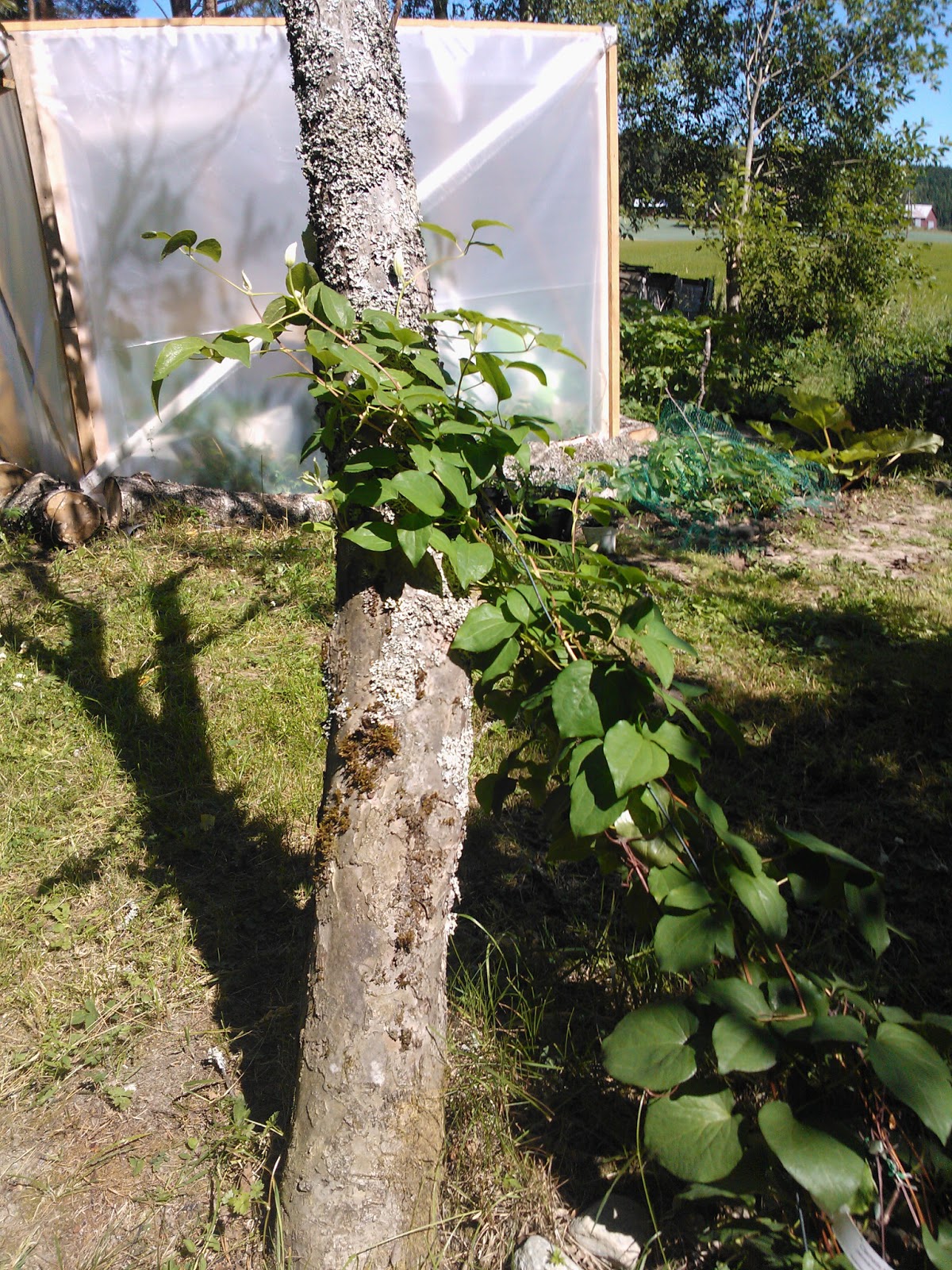 Juhlapäivänä mökillä vilisi mummua ja mummia, joten hieman jäi aikaa puutarhafiilistelyihin. Mummun idea oli laittaa Lampolasta löytynyt vanha kaunis penkki seiväsaidan eteen ja siihenhän se sitten kannettiin sen enempää empimättä. Teräskaarta pitkin istutettiin hieman suuremmat villiviinit kiipeilemään ja suurempi näistä villiviinistä pelastettiin roskalavalta. Tämä löytyi siis kuin tilauksesta.