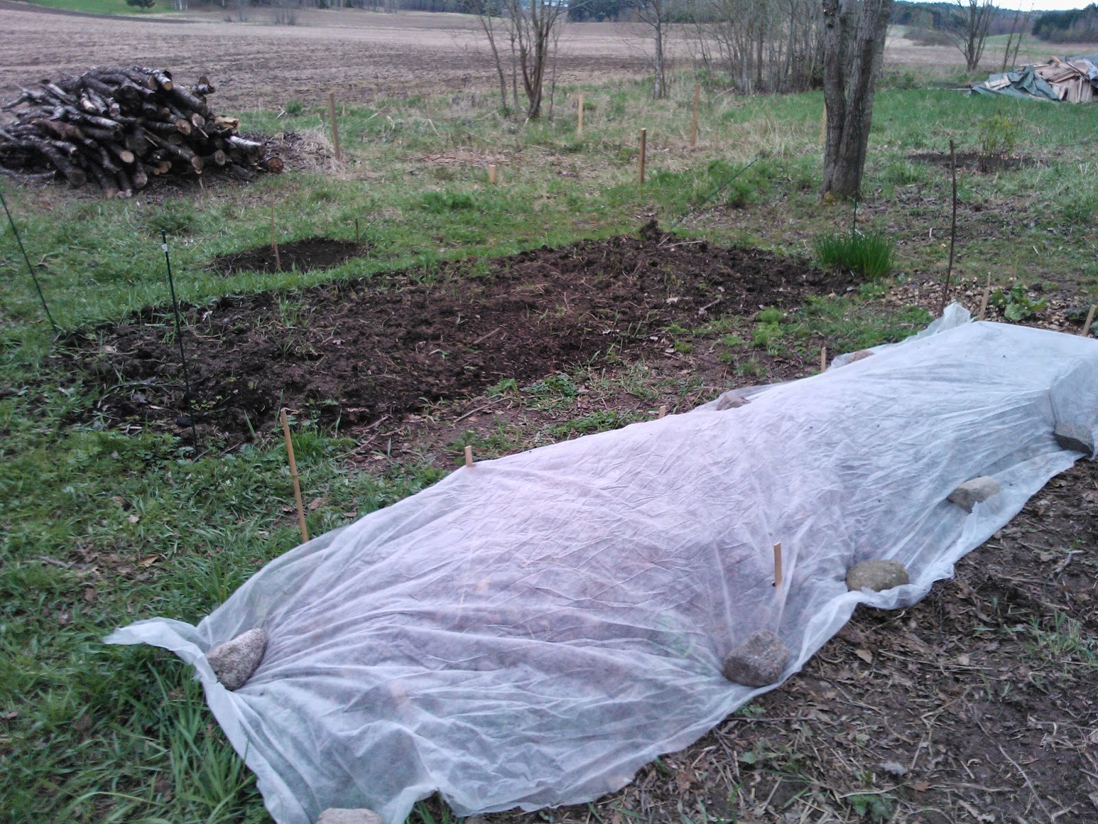 Perunamaalle istutettiin luomuperunaa ja suojattiin se harsolla viileitä öitä vastaan.