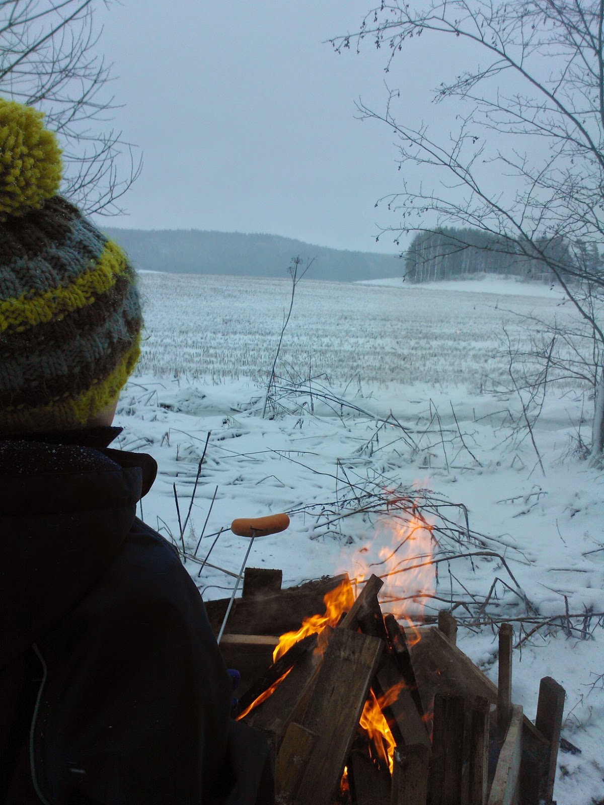 Sinisen hetken mentyä yksi torkahti nuotiolle äidin syliin kun muut vielä vahtivat tulta. Pimeyden ympäröiminä vilkutettiin mökille ja isovanhemmille ja suunnattiin kotia kohden. Automatkalla mieli täyttyi tulevan kevään suunnitelmista.