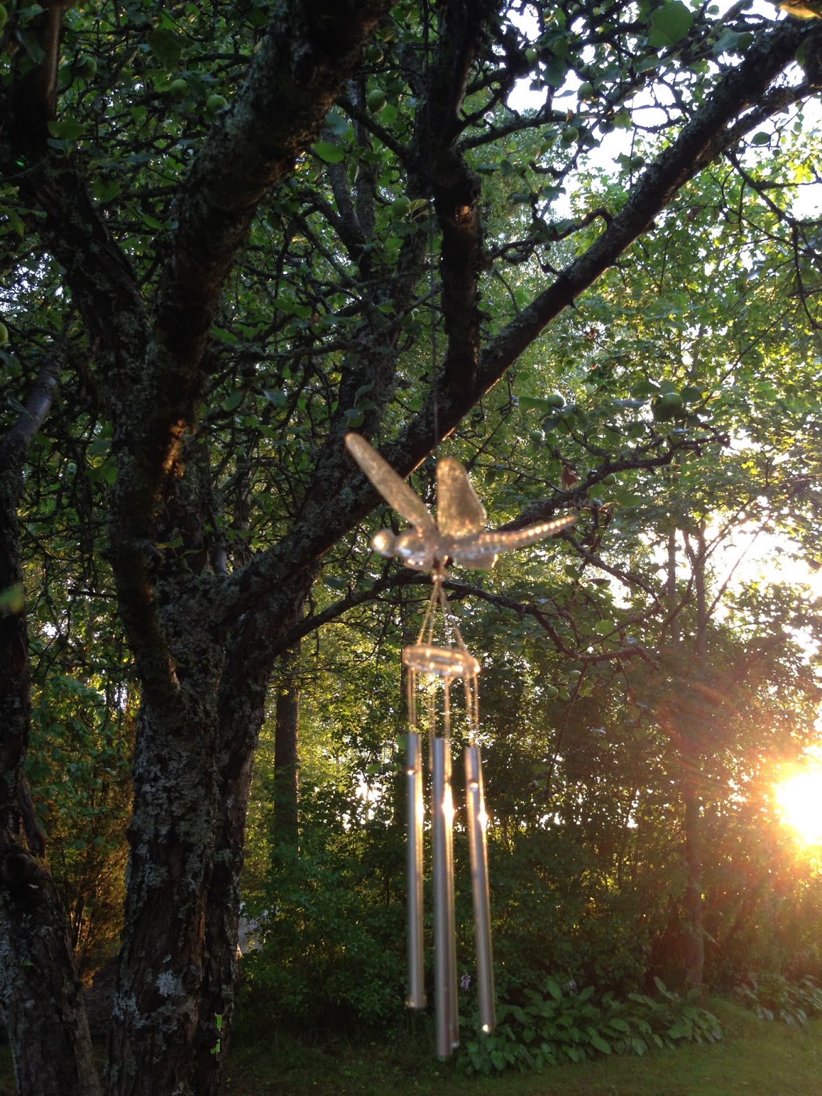 Sadepäivän illalla aurinko ilahdutti meitä. Puut ja kasvit loistivat auringon säteiden osuttua niihin. Puutarhapihamme oli kuin lumoava satumetsä. Ja mikä hiljaisuus...