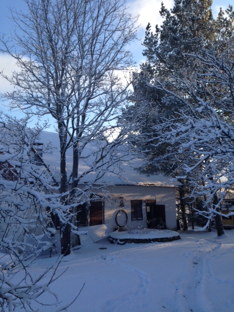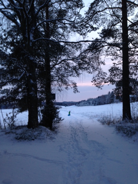 Suurempi joka jaksoi veti pienempää pulkassa. Taivas punersi ja se tiesi pimeyden tuloa. Se oli pienillekin jo kerrottu. Auton takapenkiltä kuului vielä"Wau!"kun käännyttiin katsomaan laskevaa aurinkoa puiden yläpuolella.