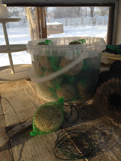 Linnuille laitettiin puihin roikkumaan ruokaa. Pienet jalanjäljet tekivät polkuja lumeen kun yhden omenapuun viereltä juostiin toisen luo.
