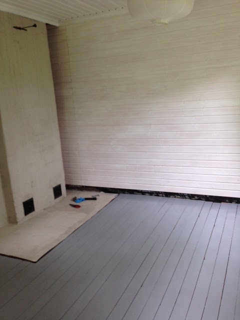 Saunan pukuhuoneen muuri on saanut pintaansa rappauksen. Se käsitellään vielä kalkkimaalilla. Lattia höylättiin, hiottiin ja maalattiin koko perheen voimin ja nyt se on saanut pintaansa kauniin siniharmaan värin. Kaunis kierrätyslattia, vaatinut vain jonkin verran työtä.