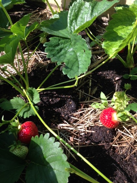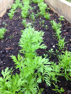 Kurkku viihtyy kasvihuoneessa. Toivottavasti on ollut muitakin pölyttäjiä liikkellä kuin mummu ja esikoinen että saadaan niitä kurkkujakin. Punajuuret ja porkkanat laitettiin kasvamaan hiukan myöhään viimeisenä valmistuneeseen laatikkoon. Porkkanoissa riittää ainakin harvennettavaa...