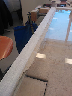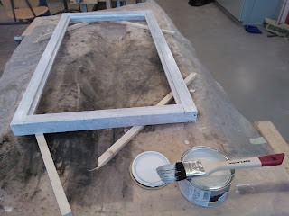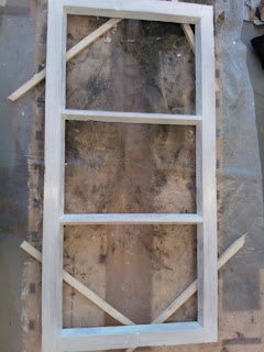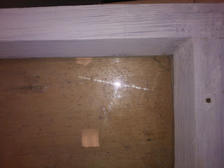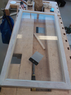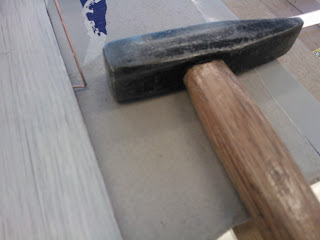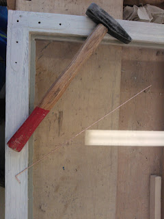 Seuraavaksi tarvitaan pieni vasara, pala pahvia ja stiftilankaa. Vaihtoehtoisesti voit käyttää pieniä nauloja joiden paikallaanpitämiseen tarvitset luultavasti pihdit. Vasarointi tapahtuu naputtelemalla stiftilankaa jonka kärki on taitettu. Lopuksi kääntele lankaa edestakaisin, niin se katkeaa taitoksen kohdalta. Stiftin tulisi olla sopivalla syvyydellä niin että se on millin korkeudella lasista mutta jää tulevan kitin alle, ja pitää ruutua paikoillaan. Käytä pientä pahvinpalaa lasin ja vasaran välissä naarmujen välttämiseksi. Kun kaikki on paikallaan voit aloittaa ulkopinnan kittaamisen. Itse aloitin kitin levittämisen kuvassa näkyvällä lastalla, mutta huomasin että se on nopeampaa pyörittelemällä ensin "pötkylöitä" ja painelemalla sitä käsin reunaan. Koko ikkunaremontin yksi hankalimmista kohdista on seuraava jossa näkyvän puolen kittauksesta yritetään saada mahdollisimman tasainen. Tätä työvaihetta varten sain käsiini yksinkertaisen mutta toimivan työkalun. Tavallisesta ruokailuveitsestä oli teräpäästä leikattu hieman vinosti palanen ja ilmeisesti hiottu pahimmat rosoisuudet pois. Idea tässä on se että ylimääräinen kitti kaavitaan veitsellä pois niin että lopuksi ympäri lasin kulkee siisti ja tasainen pinta. Aseta leikattu kohta veitsestä lasia vasten niin että toinen kulmista on lasin alla näkyvän pokan sisimmän reunan alussa. Käännä veistä sopivaan kulmaan jotta se lepää pokan päällä ja edellämainittu kulma on kohdallaan. Kuljeta veistä eteenpäin niin että se kaapii ylimääräiset kitit ja pysyy koko ajan paikallaan jottei kittauksesta tule epätasaista. Syy miksi veitsen toinen kulma kulkee lasin alla näkyvää reunaa pitkin, on se että kun toiselta puolelta poistetaan pursunneet kitit, ei etupuolen kittaus saa näkyä sisälle.