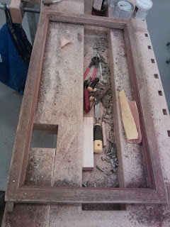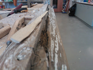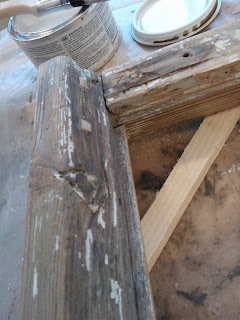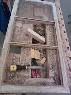 Maalin poistamiseen on monta tapaa. Vanhaa maalia voi irroittaa siihen tarkoitetulla maalinpoistoaineella, kuumailmapuhaltimella, infrapunalämmittimellä, hiomakoneella tai rapsuttamalla. Itse tein työn rapsuttamalla, enkä kokenut sitä kovinkaan työlääksi. Toisaalta kaikki riippuu siitä minkälainen maalipinta ikkunassa on. Olettaisin että edellämainitut tavat ovat kaikki hyviä. Infrapunalämmittimen etuna on se että sitä voi käyttää jo kitinpoistovaiheessa, eikä se riko ikkunan lasia. Itselläni oli ostettuna maalinpoistoon tarkoitettu kaavin joka osoittautui muuten hyväksi, mutta vaihtoteriä olisi saanut olla paljon lisää. Tähänkin työhön toimi parhaiten kunnon teräväreunainen leveä taltta. Ikkuna oli tukevasti höyläpenkissä kiinni ja maalin poistaminen onnistuikin hyvin pitämällä talttaa sopivassa kulmassa reuna pokaa vasten ja vetämällä tasaisesti itseä kohti. Parhaan ja tasaisimman lopputuloksen saa poistamalla huolellisesti kaiken maalipinnan ja hiomalla lopuksi vielä hiekkapaperilla. Kulmaraudat oli kiinni vanhoilla talttapäisillä ruuveilla jotka oli päällemaalattuja. Veitsenkärjellä sain pahimmat maalit lohkeamaan sen verran että näki kannan suunnan. Tiukimmat ruuvit lähtivät aukeamaan napauttamalla pari kertaa vasaralla ruuvimeisseliä, jolloin se upposi hieman syvemmälle ruuvin kantaan. Kulmarautojen alta saattaa paljastua varsin ikävä näky kuten kuvassa, jos raudan ja puun väliin on vuosien saatossa mennyt kosteutta. Jos kaikki pinnat ovat ehjiä, hiottu ja putsattu voidaan pokat pohjamaalata. Maalauksesta ja paikkaamisesta lisää seuraavassa päivityksessä.