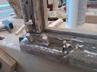 Korjaamissani ikkunoissa ei kovinkaan paljoa paikattavaa ollut. Muutama kulmarautojen ruuvin jättämä reikä oli suurentunut ja ikkunalaudan yläosassa pitkä lahovaurio. Ruuvin reijät suurensin jotta sain mahdollisimman paljon huonoa puuta pois ja liimasin puuliimalla uudet tapit. Lahovauriot ikkunalaudassa kaivettiin pois ja muotoiltiin siihen uudesta puusta sopiva paikkopalan. Kun kaikki paikatut kohdat on kuivuneet voidaan tapit katkaista oikeaan pituuteen ja lopuksi kohoumat hiotaan siistiksi. Ennen pohjamaalausta putsataan kaikki pöly ja sahanpuru pois jotta maalipinnan alle ei jäisi likaa. Pohjamaalina käytin tikkurilan OTEX pohjamaalia. Kerroksen paksuus ei ole pääasia, vaan se että sitä on tasaisesti joka paikassa. Pinta on kosketuskuiva reilussa tunnissa ja täysin kuiva seuraavana päivänä.