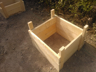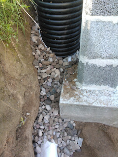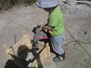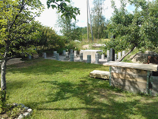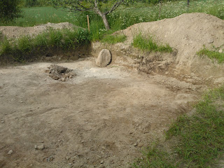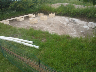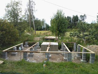 Kaivuutyöt jatkuvat, kunnes koko kallio näkyy. Jäljellä oleva maa-aines on ilmeisesti jokin luontoäidin valama betonikerros. Lapio uppoaa tasan kaksi senttiä kunnes kuuluu kolahdus ja käsissä tärähtää. Talikko oli tähän hommaan oiva ratkaisu. Ensin pehmitetään talikolla ja sitten kaivetaanruntataan- puntataanheitetään (tripla työ). Ja pakkohan sieltä kuopan pohjalata muutama tällainenkin kivi kuuluu löytyä. Onneksi vanhempi poikamme oli mukana ja kaivoi sen pois (isin oma apuri). Homma on nyt siis sitä vailla että kotiin tulee kirje jossa vastaava työjohtaja on hyväksytty. Tämän jälkeen mitataan paikat ja katsotaan että hommat etenee oikein. Tämän jälkeen voidaan alkaa rakentaa pilarilaatikoita ja laittamaan raudoituksia kuntoon. Kaivaukset ovat nyt valmiit. Hieman rapsuttelua / harjaamista tolppien kohdilta, niin että saadaan puhdas kivi esiin. Kyllähän tuo luontoäiti koetteli matkan varrella mutta antoi lahjaksi kalliopohjan jossa kaatokin on valmiina. Taas oli roskalavalla paljon hyödyllistä tavaraa. Alimman kuvan pöytä saatiin aikaiseksi neljästä lavalaidasta ja pöytälevystä. Korkeus pöydässä sattui olemaan juuri sopiva ja kas vanha pöytäkin oli millilleen oikean levyinen. Tässä siis ilmainen ja tanakka pöytä. Lavalaidoille keksittiin heti muutakin käyttöä, kuten pieni hiekkalaatikko ja mansikkamaan reunus johon oli helppo laittaa verkko päälle. Toinen hauska löytö oli kasa vanerilevyjä jotka joku olikin kiltisti sahannut 40x70cm leveyteen ajatellen varmaan meitä koska valumuotit on kokoa 40x40xKORKEUS. (jottei lastensuojelunkin tarvitse osallistua rakentamiseen, on töpseli otettu irti sirkkelistä)