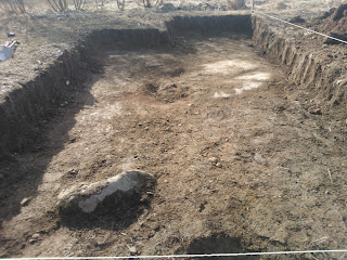 | Muutaman tunnin kaivuun jälkeen alkoi tietenkin sataa lunta. Hetken aikaa kerettiin pelätä pidempää sadetta mutta 20 minuutin päästä ilma onneksi jo selkeni. Lunta tuli kuitenkin sen verran että maa hieman kastui ja teki savesta ihanan mutaista joka tarttui saappaisiin isoina paakkuina. |